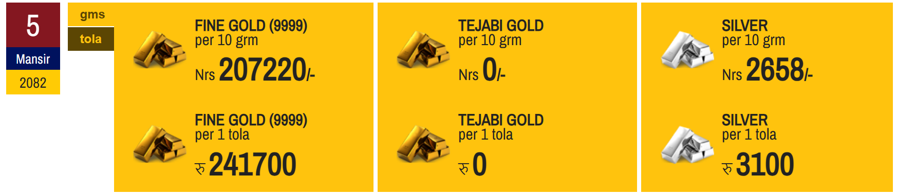 नेपाल सुनचाँदी व्यवसायी महासंघका अनुसार यस दिन सुन प्रतितोला २ लाख ४१ हजार ७०० रुपैयाँमा कारोबार भइरहेको छ । अघिल्लो दिन अर्थात बिहीबारको बजारमा प्रतितोला २ लाख ४३ हजार रुपैयाँमा कारोबार भएको थियो ।