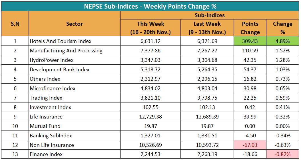 यस साता ९ उपसमूहको परिसूचक बढेको छ भने ३ उपसमूहको परिसूचक घटेको छ। एक उपसमूहको परिसूचक भने यस साता स्थिर रहेको छ। यस साता होटल तथा पर्यटन उपसमूहको परिसूचक सर्वाधिक ४.८९ प्रतिशत बढेको छ। गत साता ६३२१.६९ विन्दुमा बन्द भएको यस उपसमूहको परिसूचक, यस साता ३०९.४३ अंक बढेर ६६३१.१२ विन्दुमा पुगेको छ। अंकका आधारमा पनि यही उपसमूहको परिसूचक सर्वाधिक बढेको हो।
