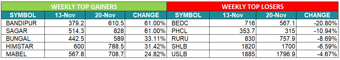यस साता बन्दीपुर केबलकार एण्ड टुरिजम र सागर डिष्टिलरीको शेयरमूल्य सर्वाधिक ६१ प्रतिशत बढेको छ। गत साता ३७९ रुपैयाँ २० पैसामा अन्तिम कारोबार भएको बन्दीपुर केबलकारको शेयर यस साता ६१० रुपैयाँ ५० पैसामा अन्तिम कारोबार भएको छ। त्यस्तै, गत साता ५१४ रुपैयाँ ३० पैसामा अन्तिम कारोबार भएको सागर डिष्टिलरीको शेयर यस साता ८२८ रुपैयाँमा अन्तिम कारोबार भएको छ। यस साता बुङ्गल हाइड्रोको शेयरमूल्य ३३ प्रतिशतभन्दा बढी बढेको छ भने हिमस्टार उर्जाको शेयरमूल्य करिब साढे ३१ प्रतिशत बढेको छ। यस साता भुगोल इनर्जी डेभलपमेन्ट कम्पनीको शेयरमूल्य सर्वाधिक २०.८० प्रतिशत घटेको छ। त्यस्तै, यस साता पिपुल्स हाइड्रोपावर कम्पनीको शेयरमूल्य करिब ११ प्रतिशत घटेको छ।