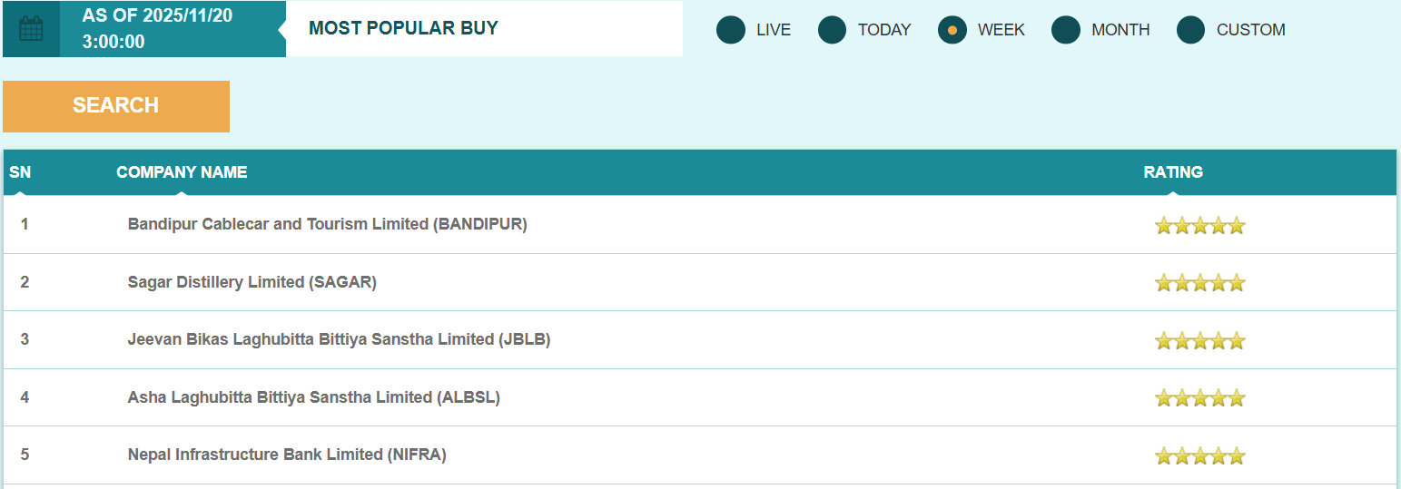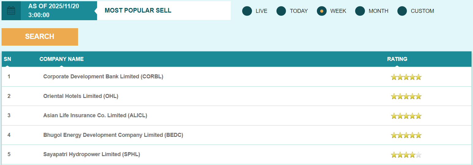 फ्लोरसिट विश्लेषण गर्दा यस साता बन्दीपुर केबलकार एण्ड टुरिजम, सागर डिष्टिलरी, जीवन विकास लघुवित्त वित्तीय संस्था लगायतका स्टकहरु मोस्ट पपुलर बाइ स्टक सूचीको शीर्ष स्थानमा रहेका छन् भने कर्पोरेट डेभलपमेन्ट बैंक, ओरियन्टल होटल, एशियन लाइफ इन्स्योरेन्स कम्पनी लगायतका स्टकहरु मोस्ट पपुलर सेल स्टक सूचीको शीर्ष स्थानमा रहेका छन्।