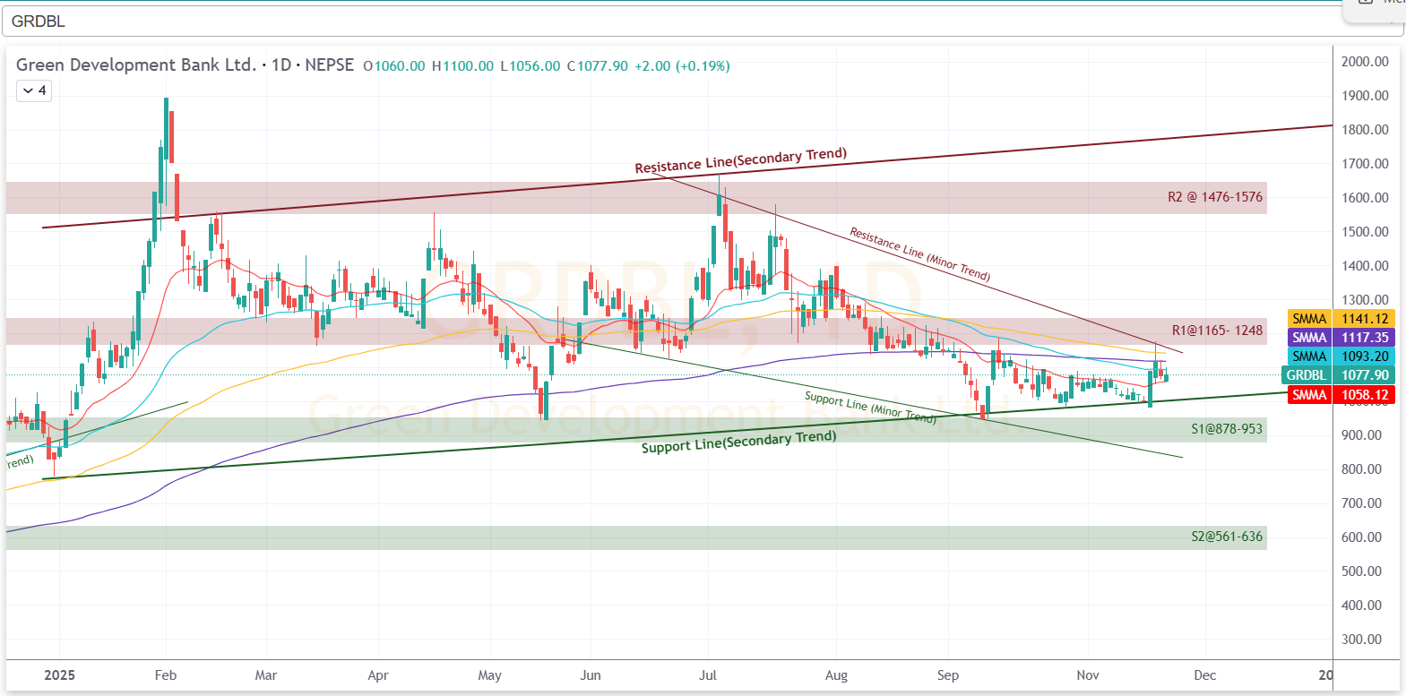 हाल बैंकको शेयरमूल्य ‘पर्ख र हेर’ को अवस्थामा रहेको छ। आगामी दिनमा बैंकको शेयरमूल्य बढेमा १ हजरा १६५ देखि १ हजार २४८ को क्षेत्रमा प्रतिरोधको सामना गर्ने देखिन्छ। तर, ओरालो लागेमा भने ८७८ देखि ९५३ को क्षेत्रमा टेवा पाउने देखिन्छ।