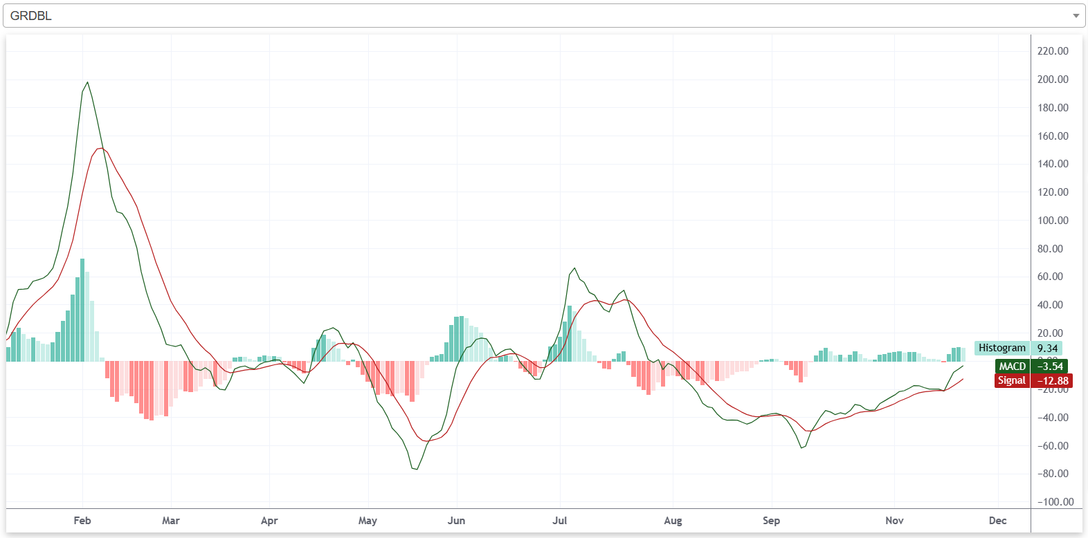 यस साताको अन्तिम कारोबार दिन बैंकको एमएसिडी रेखा सिग्नल रेखाभन्दा माथि रहेको छ र यी दुई बीचको दूरी फराकिलो हुँदै गएको छ। यसले कम्पनीको शेयरमूल्य बुलिश प्रवृत्तिमा रहेको संकेत गर्दछ। त्यसैगरी, बैंकको हिस्टोग्राम सकारात्मक क्षेत्रमा रहेको छ।