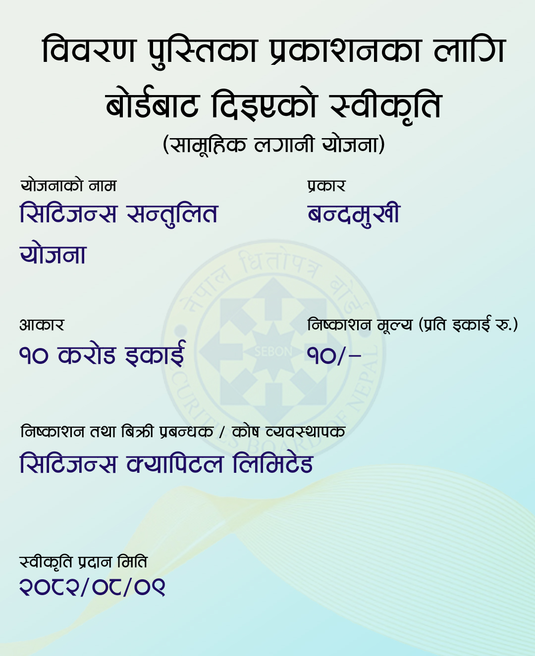 “सिटिजन्स सन्तुलित योजना” नामक सामूहिक लगानी योजनालाई धितोपत्र बोर्डले प्राथमिक निष्कासन अनुमति दिएको छ। बोर्डले जारी गरेको सूचना अनुसार बोर्डले योजनालाई मङ्गलवार स्वीकृत गरेको हो।
