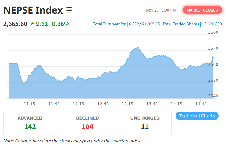 यस दिन नेप्से परिसूचक ९.६१ अंक बढेर २६६५.६० विन्दुमा पुगेको छ। त्यस्तै, यस दिन सेन्सेटिभ इण्डेक्स १.६४ अंक बढेको छ भने फ्लोट इण्डेक्स ०.५४ अंक र सेन्सेटिभ फ्लोट इण्डेक्स ०.४९ अंक बढेको छ।