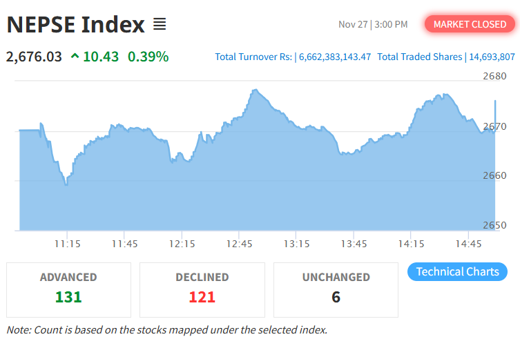 बिहीबार नेप्से परिसूचक १०.४३ अंक बढेर २६७६.०३ विन्दुमा पुगेको छ। त्यस्तै, यस दिन सेन्सेटिभ इण्डेक्स २.४८ अंक बढेको छ भने फ्लोट इण्डेक्स १.१४ अंक र सेन्सेटिभ फ्लोट इण्डेक्स १.२१ अंक बढेको छ।