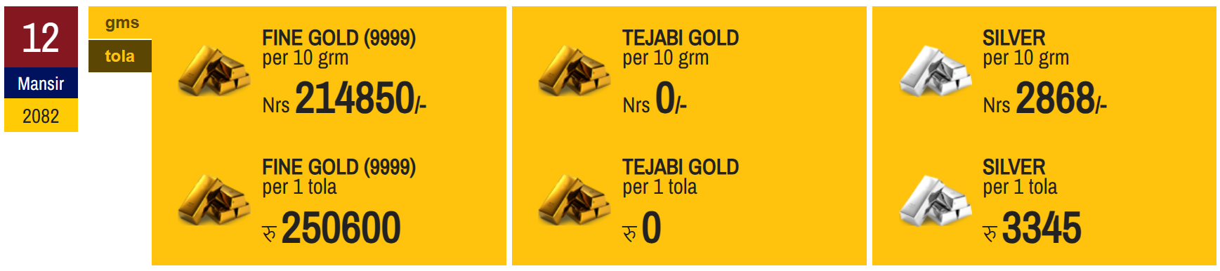 त्यसैगरी, यस दिन चाँदी प्रतितोला ६५ रुपैयाँले बढेको हो । शुक्रबारको बजारमा चाँदी तीन हजार ३४५ रुपैयाँमा खरिदबिक्री भएको छ । बिहीबारको बजारमा चाँदी प्रतितोला तीन हजार २८० रुपैयाँमा कारोबार भएको थियो ।