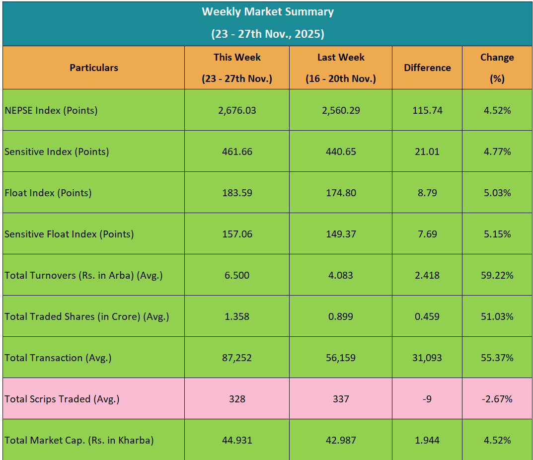 यस साता ५ कारोबार दिनका लागि बजार खुलेको थियो। जसमध्ये पाँचै कारोबार दिन नेप्से बढेको थियो।
