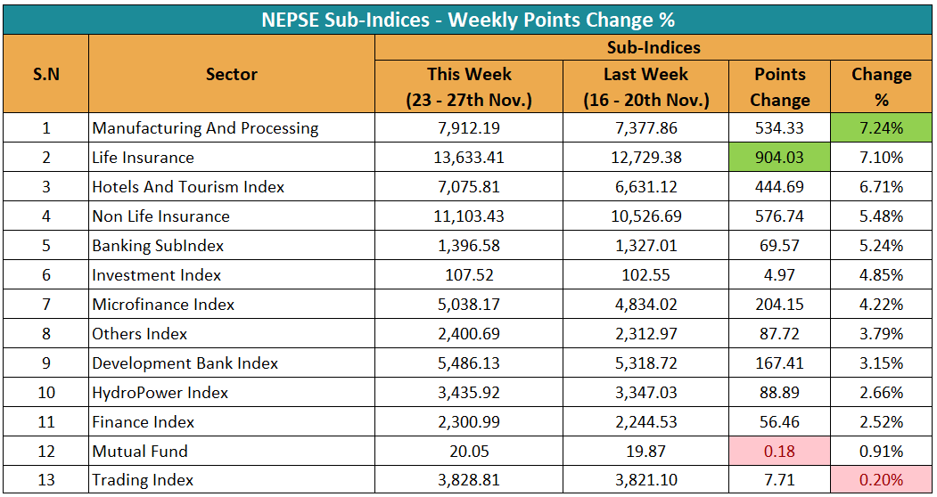 यस साता १३ वटै उपसमूहको परिसूचक बढेको छ। यस साता उत्पादन तथा प्रशोधन उपसमूहको परिसूचक सर्वाधिक ७.२४ प्रतिशत बढेको छ। गत साता ७३७७.८६ विन्दुमा बन्द भएको यस उपसमूहको परिसूचक, यस साता ५३४.३३ अंक बढेर ७९१२.१९ विन्दुमा पुगेको छ। अंकका आधारमा भने यस साता जीवन बीमा उपसमूहको परिसूचक सबैभन्दा बढी बढेको छ। गत साता १२ हजार ७२९.३८ विन्दुमा बन्द भएको यस उपसमूहको परिसूचक, यस साता ९०४.०३ अंक बढेर १३ हजार ६३३.४१ विन्दुमा पुगेको छ।