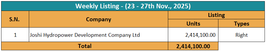 नेप्सेमा यस साता जोशी हाइड्रोपावर डेभलपमेन्ट कम्पनीको २४ लाख १४ हजार १०० कित्ता हकप्रद शेयर सूचीकृत भएको छ।