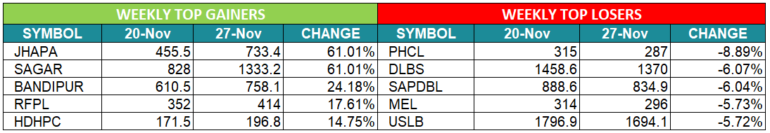 यस साता झापा इनर्जी र सागर डिष्टिलरीको शेयरमूल्य सर्वाधिक ६१.०१ प्रतिशत बढेको छ। गत साता ४५५ रुपैयाँ ५० पैसामा अन्तिम कारोबार भएको झापा इनर्जीको शेयर यस साता ७३३ रुपैयाँ ४० पैसामा अन्तिम कारोबार भएको छ। त्यस्तै, गत साता ८२८ रुपैयाँमा अन्तिम कारोबार भएको सागर डिष्टिलरीको शेयर यस साता १हजार ३३३ रुपैयाँ २० पैसामा अन्तिम कारोबार भएको छ। यस साता बन्दीपुर केबलकार एण्ड टुरिजमको शेयरमूल्य २४ प्रतिशतभन्दा बढी बढेको छ भने रिभर फल्सको शेयरमूल्य साढे १७ प्रतिशतभन्दा बढी बढेको छ। यस साता पिपुल्स हाइड्रोपावर कम्पनीको शेयरमूल्य सर्वाधिक ८.८९ प्रतिशत घटेको छ।