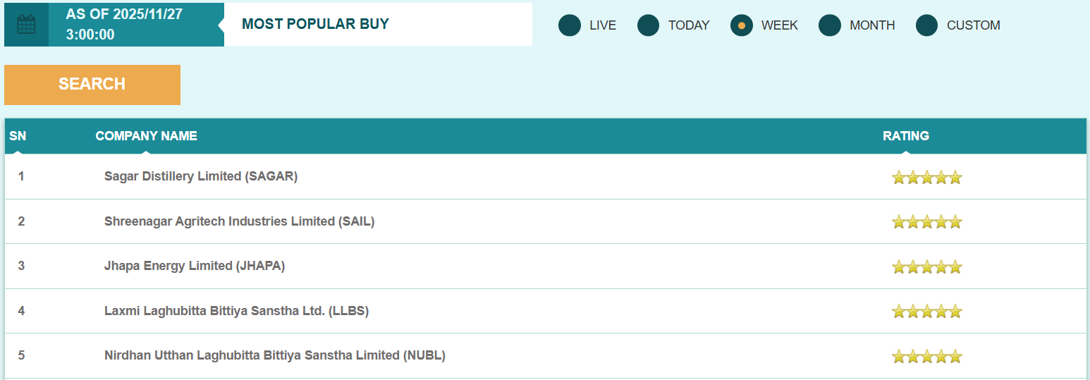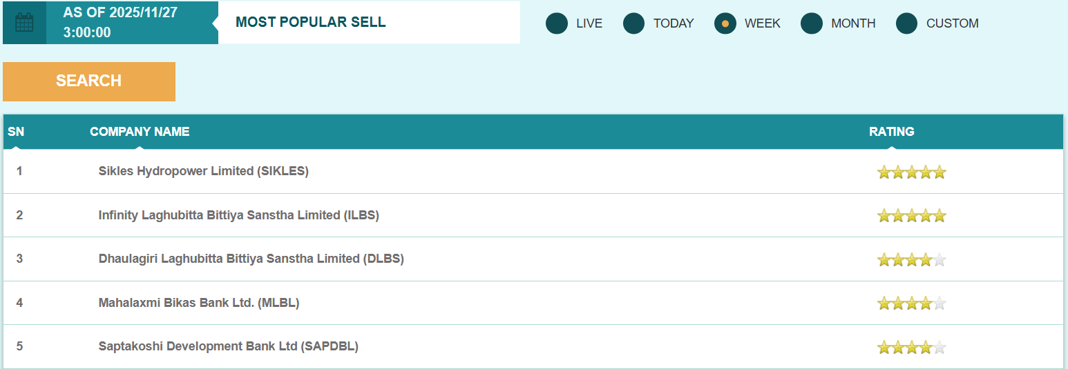 फ्लोरसिट विश्लेषण गर्दा यस साता सागर डिष्टिलरी, श्रीनगर एग्रीटेक इन्डष्ट्रीज, झापा इनर्जी लगायतका स्टकहरु मोस्ट पपुलर बाइ स्टक सूचीको शीर्ष स्थानमा रहेका छन् भने सिक्लेस हाइड्रोपावर, इन्फिनिटी लघुवित्त वित्तीय संस्था, धौलागिरी लघुवित्त वित्तीय संस्था लगायतका स्टकहरु मोस्ट पपुलर सेल स्टक सूचीको शीर्ष स्थानमा रहेका छन्।