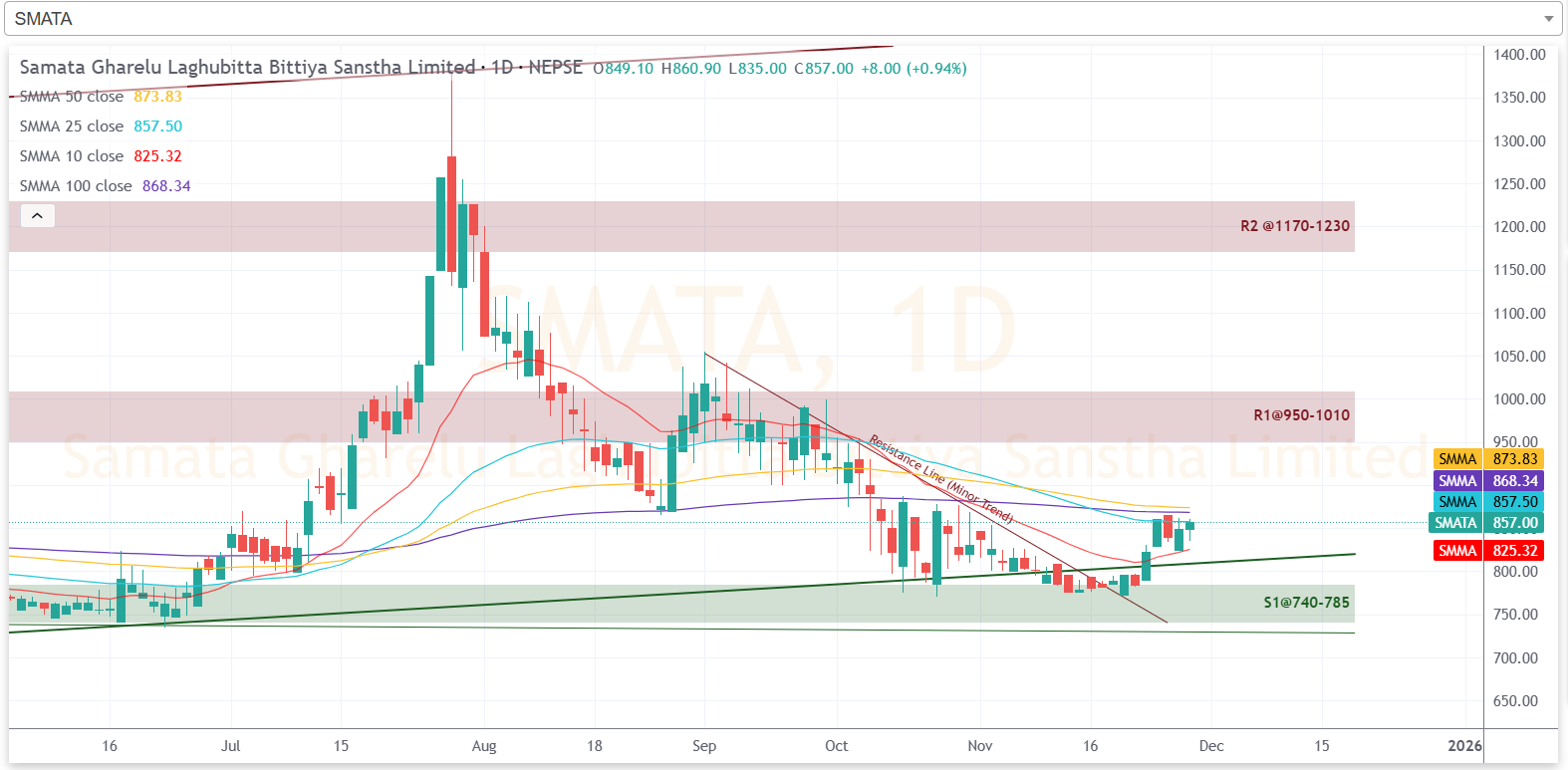 यस साता लघुवित्तको शेयरमूल्य ‘पर्ख र हेर’ को अवस्थामा रहेको छ। गत साता मात्र लघुवित्तको शेयरमूल्य ७४० देखि ७८५ को क्षेत्रमा टेवा पाएर उकालो लागेको हो। आगामी साता लघुवित्तको शेयरमूल्य उकालो लागेमा ९५० देखि १ हजार १० को क्षेत्रमा प्रतिरोधको सामना गर्ने देखिन्छ।