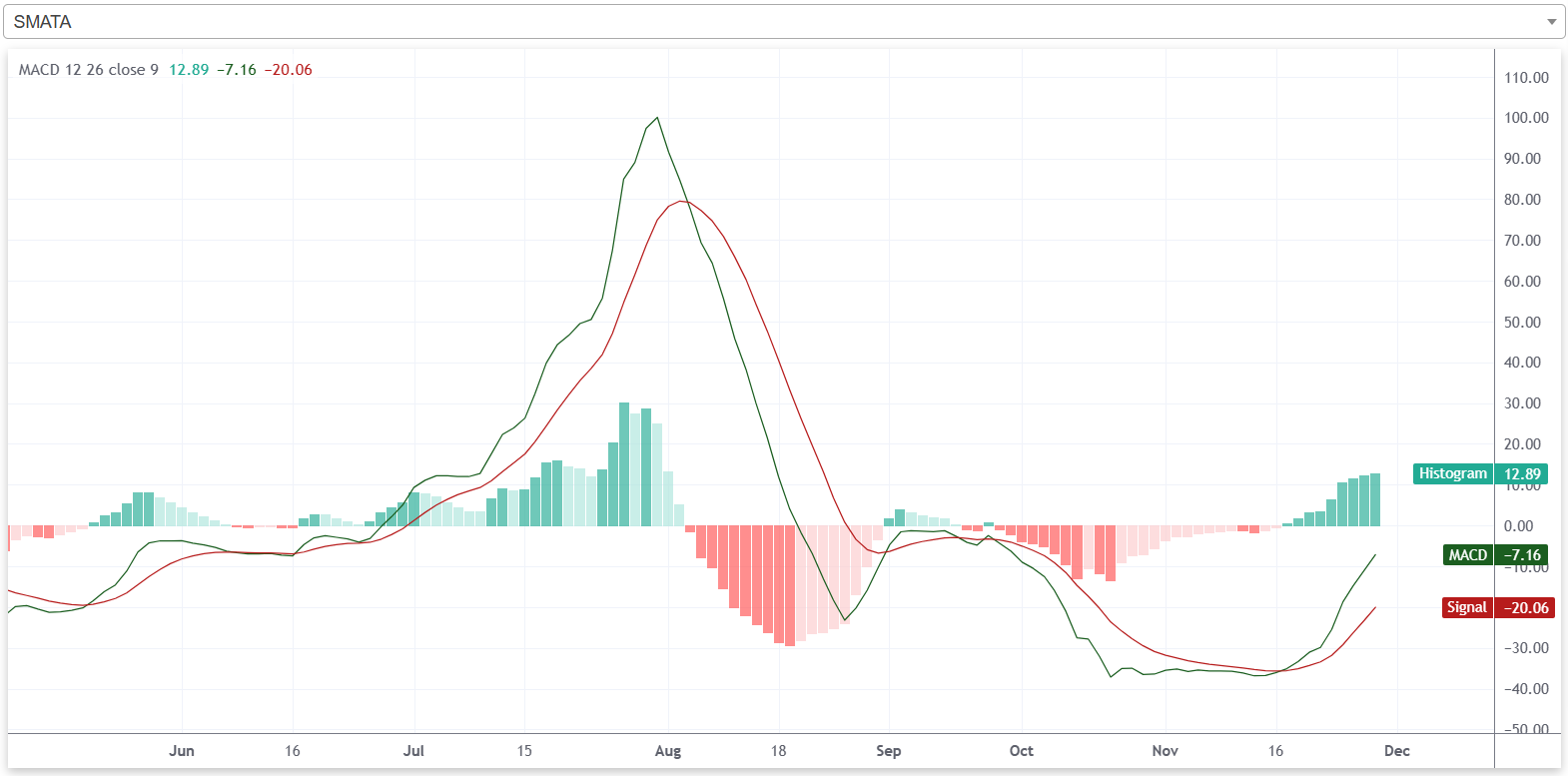 यस साता लघुवित्तको एमएसिडी रेखा सिग्नल रेखाभन्दा माथि रहेको छ र यी दुबै रेखाबीचको दूरी फराकिलो बन्दै गइरहेको छ। यसका साथै लघुवित्तको हिस्टोग्राम पनि सकारात्मक क्षेत्रमा रहेको छ। यसले यस साता लघुवित्तको शेयर बुलिश प्रवृत्तिमा रहेको संकेत गर्दछ।