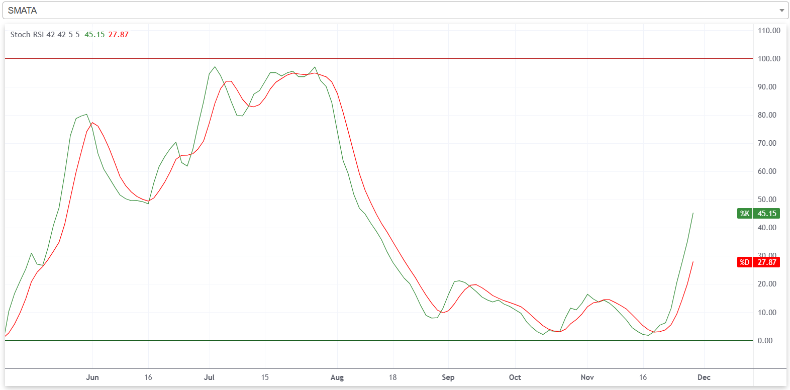 यस साता लघुवित्तको स्टकास्टिक आरएसआई न्यूट्रल जोनमा रहेको छ। यसले सो साता लघुवित्तको शेयरमा खरिदबिक्री चाप सन्तुलनमा रहेको संकेत गर्दछ।