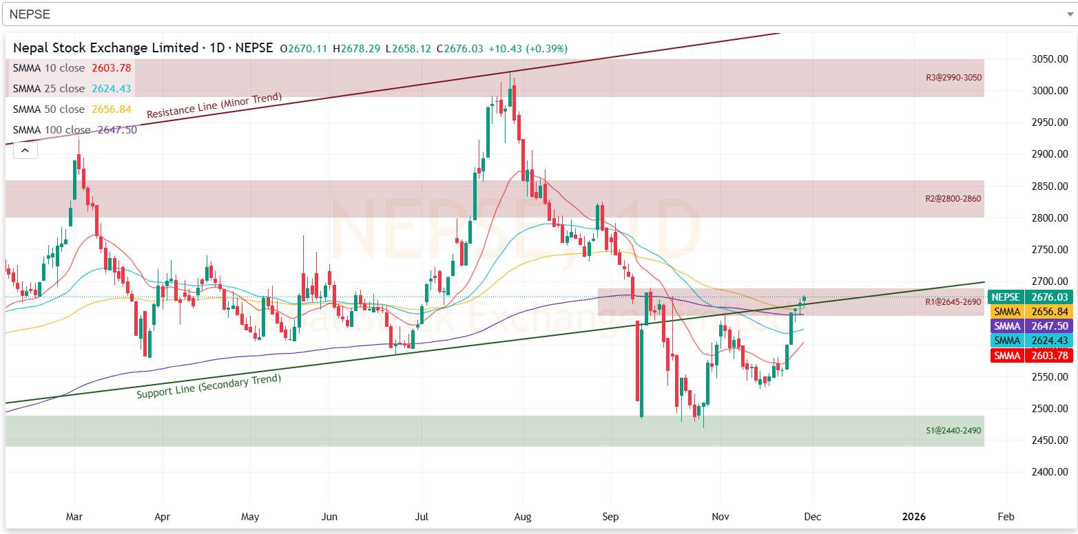 गत साता नेप्से प्रतिरोध क्षेत्रमा रहेको छ। हाल नेप्सेको प्रतिरोध क्षेत्र २६४५ देखि २६९० सम्म रहेको छ। आगामी दिनमा नेप्सेले सो क्षेत्रमा प्रतिरोधको सामना गरी ओरालो लागेमा २४४० देखि २४९० को क्षेत्रमा टेवा पाउने देखिन्छ। तर, सो प्रतिरोध तोडेर उकालो लागेमा २८०० देखि २८६० को क्षेत्रमा प्रतिरोधको सामना गर्ने देखिन्छ।