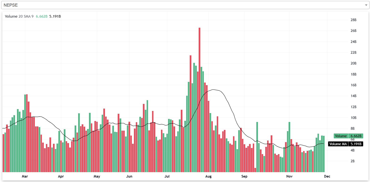 गत साता नेप्सेको भोल्यूम पनि बलियो रहेको छ। गत साता नेप्सेमा दैनिक औषतमा ६ अर्ब ५० करोडको शेयर कारोबार भएको थियो। साताको अन्तिम कारोबार दिन नेप्सेको २० दिने औषत भोल्यूम ५ अर्ब १९ करोड रहेको छ। २० दिने औषत भोल्यूमको तुलनामा गत साताको दैनिक औषत भोल्यूम २५.२४ प्रतिशत बढी हो।