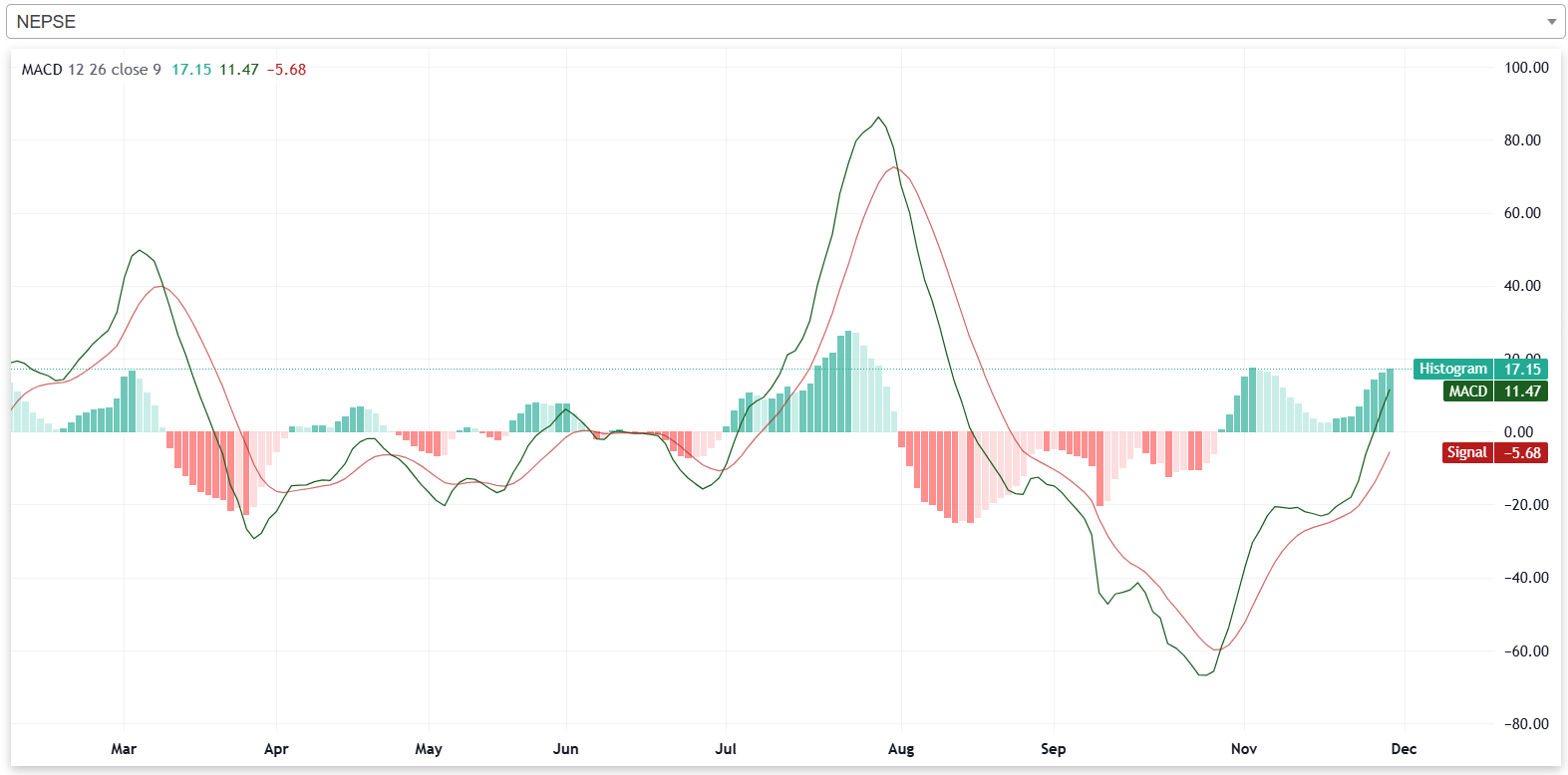 गत साता नेप्से परिसूचक बुलिश प्रवृत्तिमा रहेको छ। गत साता नेप्सेको एमएसिडी रेखा, सिग्नल रेखाभन्दा माथि रहेको छ। साथै, यी दुई रेखा बीचको दूरी फराकिलो हुँदै गइरहेको छ। गत साता नेप्सेको हिस्टोग्राम सकारात्मक क्षेत्रमा बढ्दो क्रममा रहेको छ।