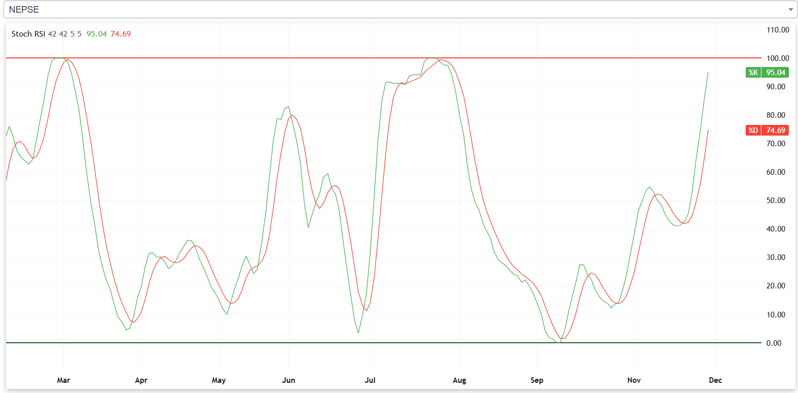 गत साता नेप्सेको स्टकास्टिक आरएसआई ओभरबट जोन रहेको छ। यसले गत साता बजारमा बिक्रीचापको तुलनामा खरिदचाप बढी रहेको संकेत गर्दछ।