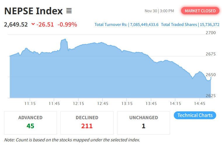 गत साता नेप्से परिसूचक ११५.७२ अंक बढेको थियो। बजार बढेको मौकामा अल्पकालिन लगानीकर्ताहरुले नाफा सुरक्षित गर्दा यस दिन नेप्सेमा करेक्सन भएको हो। यस दिन नेप्से परिसूचक २६.५१ अंक घटेर २६४९.५२ विन्दुमा झरेको छ। त्यस्तै, यस दिन सेन्सेटिभ इण्डेक्स ४.६७ अंक घटेको छ भने फ्लोट इण्डेक्स २.०६ अंक र सेन्सेटिभ फ्लोट इण्डेक्स १.६६ अंक घटेको छ।
