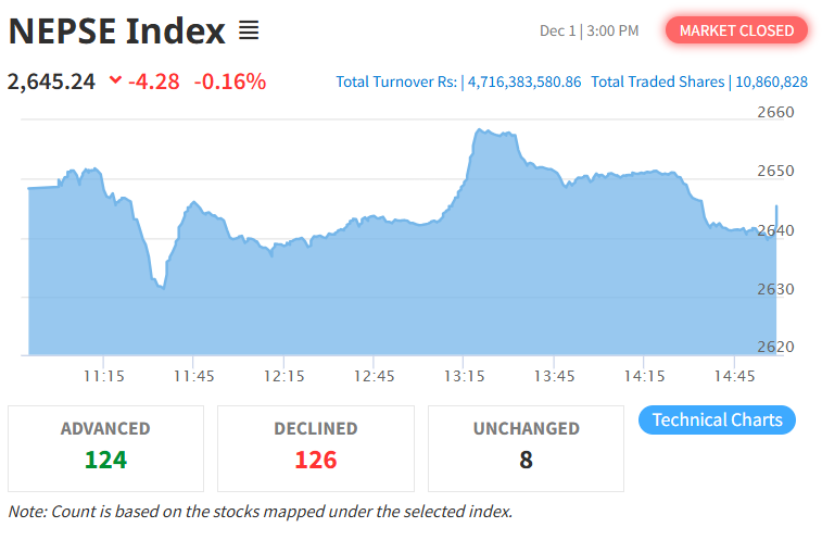 सोमबार नेप्से परिसूचक ४.२८ अंक घटेर २६४५.२४ विन्दुमा झरेको छ। त्यस्तै, यस दिन सेन्सेटिभ इण्डेक्स १.७२ अंक घटेको छ भने फ्लोट इण्डेक्स ०.५० अंक र सेन्सेटिभ फ्लोट इण्डेक्स ०.७६ अंक घटेको छ।