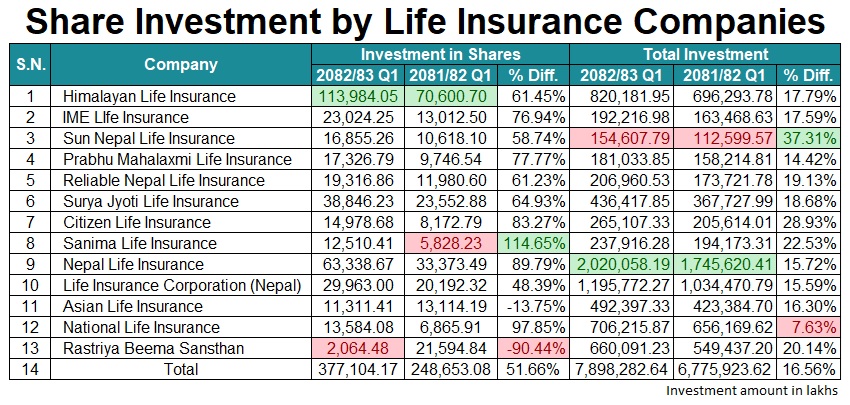 सुर्य ज्योति लाइफले ३ अर्ब ८८ करोड ४६ लाख, एलआईसी नेपालले २ अर्ब ९९ करोड ६३ लाख, आईएमई लाइफले २ अर्ब ३० करोड २४ लाख, रिलायवल नेपाल लाइफले १ अर्ब ९३ करोड १६ लाख, प्रभु महालक्ष्मी लाइफले १ अर्ब ७३ करोड २६ लाख रुपैयाँ, सन नेपाल लाइफले १ अर्ब ६८ करोड ५५ लाख रुपैयाँ, सिटिजन लाइफले १ अर्ब ४९ करोड ७८ लाख रुपैयाँ, नेसनल लाइफले १ अर्ब ३५ करोड ७४ लाख रुपैयाँ, सानिमा लाइफले १ अर्ब २५ करोड १० लाख रुपैयाँ र एसियन लाइफले १ अर्ब १३ करोड ११ लाख रुपैयाँ शेयर बजारमा लगानी गरेका छन् । सरकारी लगानी रहेको राष्ट्रिय बीमा संस्थानले सबैभन्दा कम २० करोड ६४ लाख रुपैयाँ शेयर बजारमा लगानी गर्दा मेट लाइफको भने शेयर बजारमा लगानी छैन ।