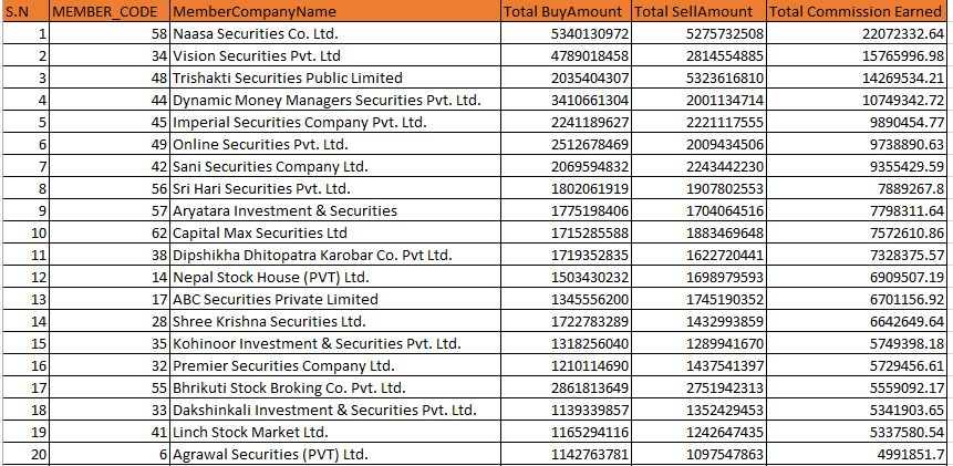 नेप्सेले प्रकाशित गरेको मासिक विवरण अनुसार ९२ ब्रोकर कम्पनीहरूले कुल ३२ करोड ७७ लाख १५ हजार २९८.९० रुपैयाँ आम्दानी गरेका हुन्। जुन रकम उनीहरूको चोखो आम्दानी हो। त्यसमा नेप्सेलाई तिर्नु पर्ने कमिसन र कर दुवै कट्टा गरिएको नेप्सेले जनाएको छ।