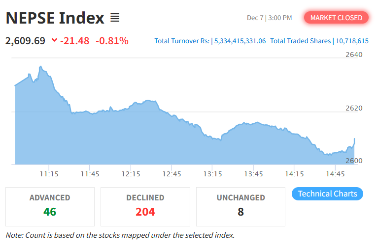आइतबार नेप्से परिसूचक २१.४८ अंक घटेर २६०९.६९ विन्दुमा झरेको छ। त्यस्तै, यस दिन सेन्सेटिभ इण्डेक्स २.७० अंक घटेको छ भने फ्लोट इण्डेक्स १.५७ अंक र सेन्सेटिभ फ्लोट इण्डेक्स १.१४ अंक घटेको छ।