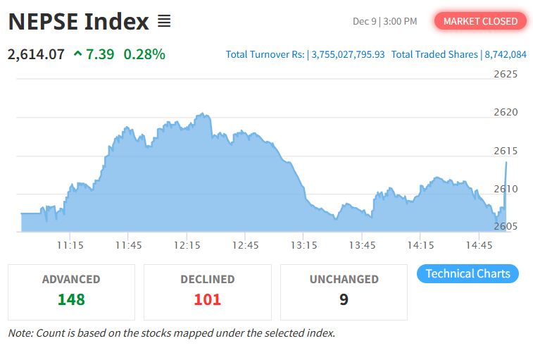 यस दिन नेप्से परिसूचक ७.३९ अंक बढेर २६१४.०७ विन्दुमा पुगेको छ। त्यस्तै, यस दिन सेन्सेटिभ इण्डेक्स ०.३० अंक बढेको छ भने फ्लोट इण्डेक्स ०.३९ अंक र सेन्सेटिभ फ्लोट इण्डेक्स ०.१० अंक बढेको छ।