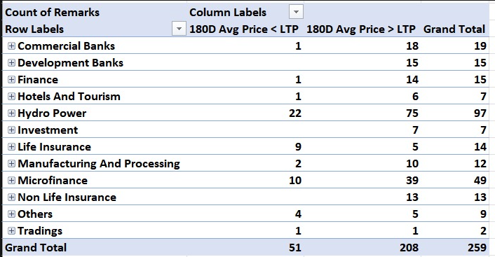 सबै समूहका कम्पनीको शेयर मूल्य १८० दिनको औसत मूल्य भन्दा तल झरेका छन्। जसमा वाणिज्य बैंक समूहमा सूचीकृत १९ कम्पनीमा १८ कम्पनीको मूल्य तल झरेका छन्। विकास बैंक समूहमा सूचीकृत सबै कम्पनीको मूल्य १८० दिनको औसत मूल्य भन्दा तल छन्। निर्जीवन बिमा समूहमा रहेका कम्पनीहरूको पनि उस्तै अवस्था छ। समूहमा रहेका सबै कम्पनीको मूल्य १८० दिनको औसत मूल्य भन्दा कम छन्। जलविद्युत कम्पनी लघुवित्तका कम्पनीहरूको मूल्य भने केही हदसम्म १८० दिनको मूल्य भन्दा केही माथि छन्।