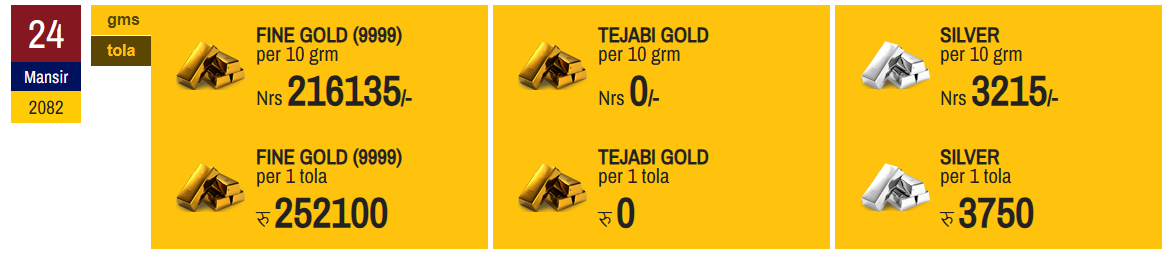 यस दिन सुनको मूल्य प्रतितोला २०० रुपैयाँ बढेको छ भने चाँदीको मूल्य तोलामा १५० रुपैयाँ बढेर नयाँ रेकर्ड बनाएको हो।