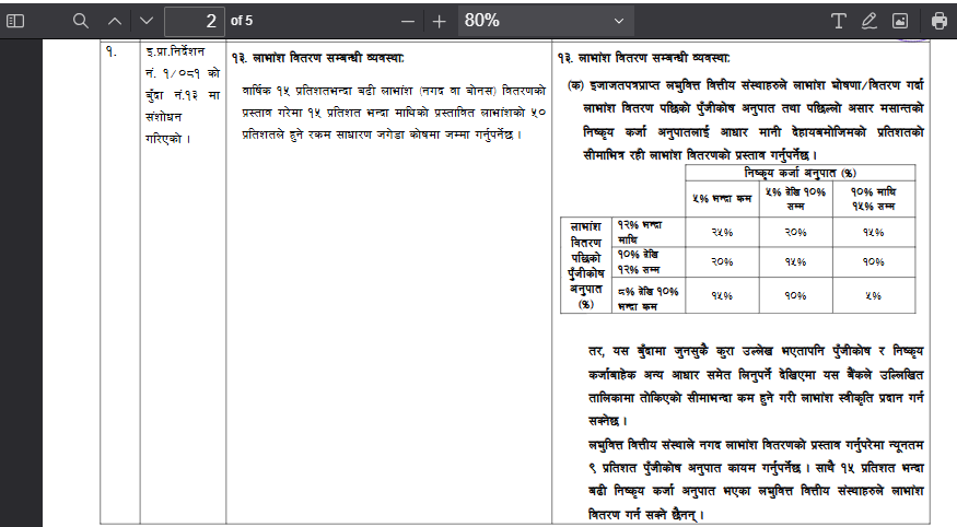 यस्तै पूँजी कोष १२ प्रतिशतभन्दा माथि भए पनि, निष्क्रिय ऋण ५ देखि १० प्रतिशत भएमा २० प्रतिशत लाभांश दिन सक्छन्। यसैगरी पूँजी कोष अनुपात १२ प्रतिशतभन्दा माथि भएमा, निष्क्रिय ऋण १० प्रतिशतदेखि १५ प्रतिशतभन्दा माथि भए पनि १५ प्रतिशतसम्म लाभांश वितरण गर्न सक्छन्।