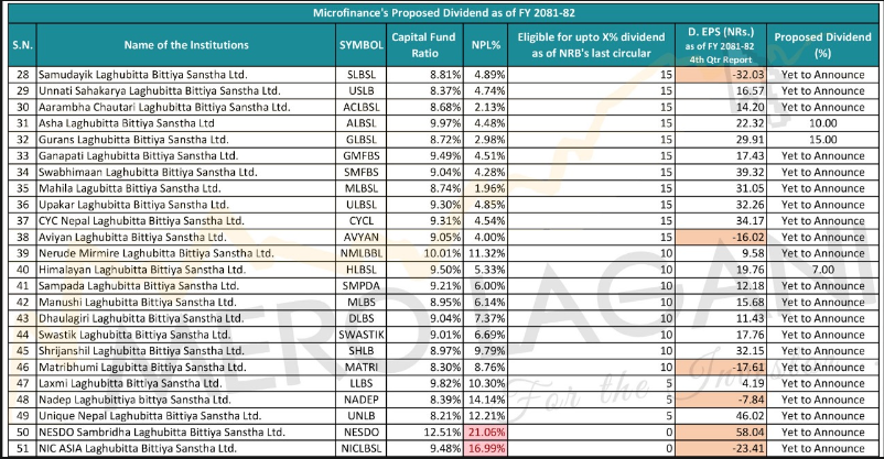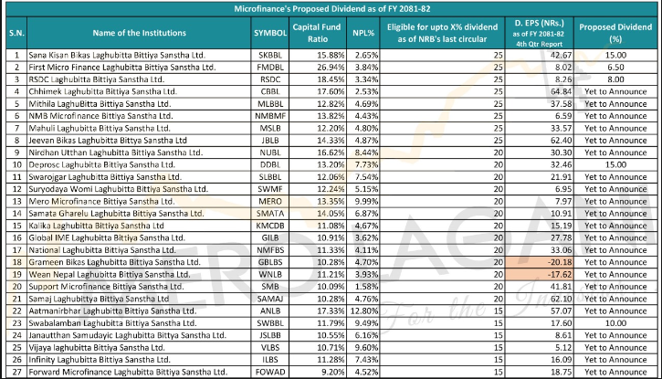 गत आर्थिक वर्षको वित्तीय विवरण र राष्ट्र बैंकको मापदण्ड अनुसार ११ लघुवित्तले २० प्रतिशतसम्म लाभांश दिन सक्छन् भने १५ वटाले १५ प्रतिशतसम्म लाभांश दिन सक्छन्। यसैगरी सात वटाले १० प्रतिशतसम्म लाभांश दिन सक्छन् भने एक लघुवित्तले पाँच प्रतिशतसम्म लाभांश दिन सक्छ।