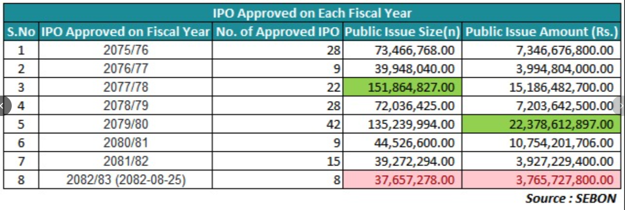 यसरी हेर्दा चालु वर्ष बोर्डले दिएको अनुमतिलाई आईपीओको वर्षा वा निक्कै धेरै निष्कासन अनुमति दिएको भनेर भन्न मिल्ने अवस्था छैन। बरु अघिल्ला बर्षहरूको तुलनामा निष्कासन अनुमति कम नै भन्न सकिन्छ।