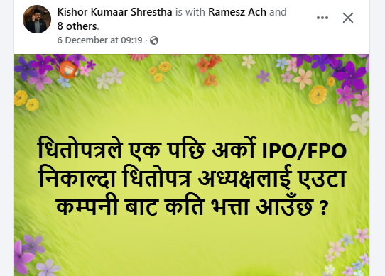 जसले धितोपत्र बोर्डलाई समेत कन्फ्युजन बनाएको छ। “केहीले संस्थागत रुपमा नै निष्कासन अनुमति नदिएको भन्दै चर्को आलोचना गरिरहेका छन्। अर्को तर्फ निष्कासन अनुमति तीव्र पारेको भन्दै केही लगानीकर्ता उफ्रिरहेका छन्। के गर्ने के नगर्ने ?, ” धितोपत्र बोर्डका अध्यक्ष सन्तोष नारायण श्रेष्ठले मेरो लगानीसँग भने।