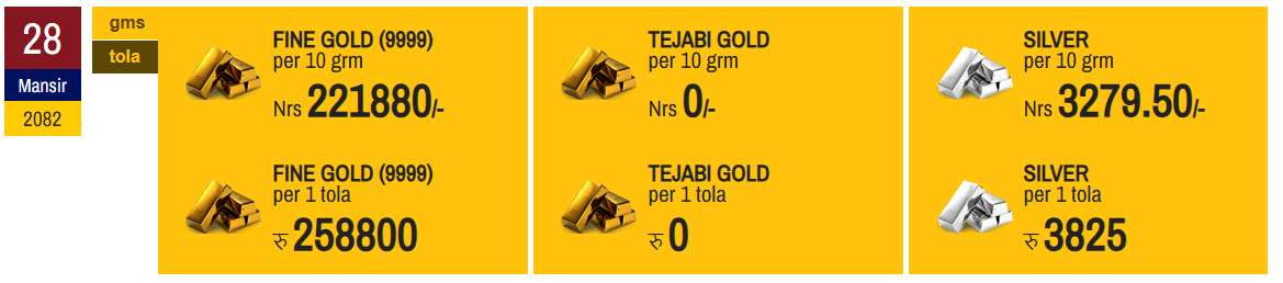 यस दिन सुनको मूल्य प्रतितोला दुई हजार २०० रुपैयाँ बढेको छ भने चाँदीको मूल्य तोलामा ८० रुपैयाँले घटेको हो ।