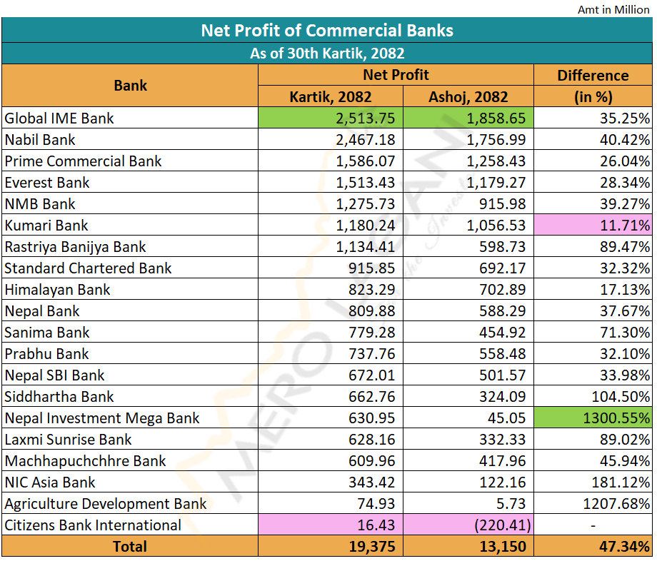 चालु आर्थिक वर्षको असोज मसान्तसम्ममा १३ अर्ब १५ करोड रुपैयाँ खुद नाफा कमाएका २० वाणिज्य बैंकहरुले, कात्तिक महिनासम्ममा १९ अर्ब ३७ करोड रुपैयाँ यस्तो नाफा कमाएको छन्। समीक्षा अवधिमा बैंकको यस्तो नाफा ४७.३४ प्रतिशत बढेको हो।