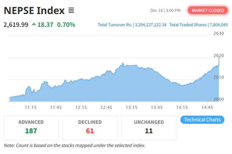 यस दिन नेप्से परिसूचक १८.३७ अंक बढेर २६१९.९९ विन्दुमा पुगेको छ। त्यस्तै, यस दिन सेन्सेटिभ इण्डेक्स ३.१५ अंक बढेको छ भने फ्लोट इण्डेक्स १.३२ अंक र सेन्सेटिभ फ्लोट इण्डेक्स १.०२ अंक बढेको छ।