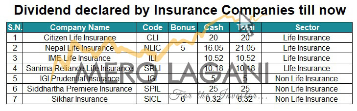 नेपाल लाइफले गत वर्षको नाफाबाट ५ प्रतिशत बोनस शेयर र १६.०५ नगद लाभांश गरी कुल २१.०५ प्रतिशत लाभांश घोषणा गरेकाे छ भने यता निर्जीवन बीमातर्फ शिखर इन्स्योरेन्सले ६ प्रतिशत बोनस शेयर र त्यसमा लाग्ने करस्वरुप ०.३२ प्रतिशत नगद लाभांश गरी कुल ६.३२ प्रतिशत लाभांश घोषणा गरेकाे छ । त्यस्तै सिटिजन्स लाइफ इन्स्योरेन्सले २० प्रतिशत, आईएमई लाइफ इन्स्योरेन्सले १०.५२ प्रतिशत र सानिमा रिलायन्स लाइफ इन्स्योरेन्सले १०.१८ प्रतिशत, आईआजीआई प्रुडेन्सियल इन्स्योरेन्सले ५ प्रतिशत र सिद्धार्थ प्रिमियर इन्स्योरेन्सले २५ प्रतिशत नगद लाभांश घोषणा गरेका छन् ।
