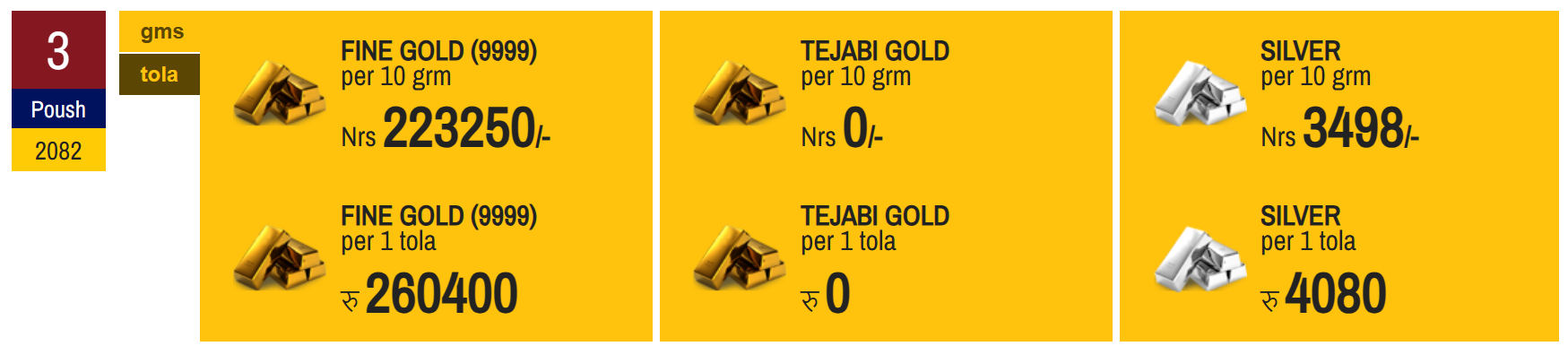 पुस ३ गते, बिहीबार, नेपाली बजारमा सुन र चाँदीको मूल्य बढेको छ । यस दिन सुन प्रतितोला ७०० रुपैयाँले बढेको छ भने चाँदी तोलामा २५ रुपैयाँले बढेर नयाँ रेकर्ड बनाएको छ ।