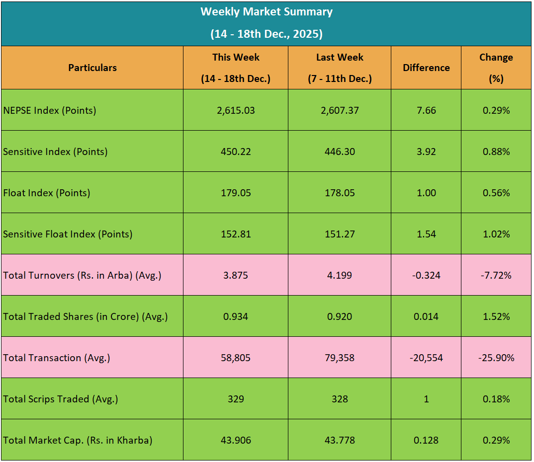 यस साता नेप्सेको कुल बजार पूँजीकरण पनि सामान्य बढेको छ। गत साताको अन्तिम कारोबार दिन ४३ खर्ब ७७ अर्ब रुपैयाँ रहेको नेप्सेको कुल बजार पूँजीकरण, यस साता १२ अर्ब रुपैयाँ बढेर ४३ खर्ब ७७ अर्ब रुपैयाँ पुगेको छ।