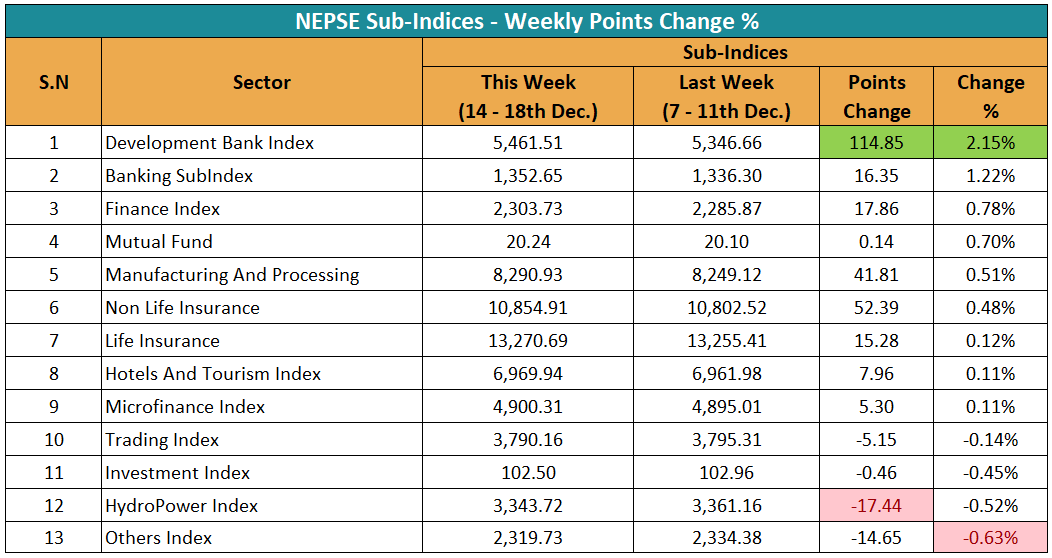 १३ उपसमूहमध्ये यस साता ९ उपसमूहको परिसूचक बढेको छ भने ४ उपसमूहको परिसूचक घटेको छ। यस साता विकास बैंक उपसमूहको परिसूचक सर्वाधिक २.१५ प्रतिशत बढेको छ। गत साता ५३४६.६६ विन्दुमा बन्द भएको यस उपसमूहको परिसूचक, यस साता ११४.८५ अंक बढेर ५४६१.५१ विन्दुमा पुगेको छ। अंकका आधारमा पनि यस साता सोही उपसमूहको परिसूचक सबैभन्दा बढी बढेको छ।