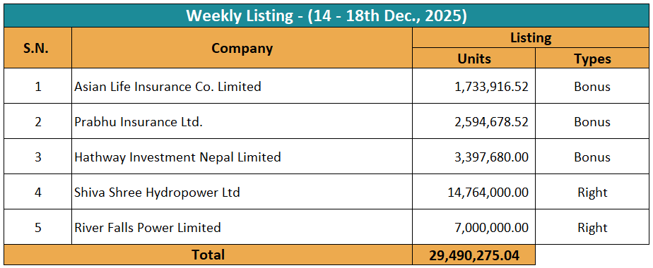 नेप्सेमा यस साता ५ स्टकको २ करोड ९४ लाख ९० हजार २७५.०४ कित्ता शेयर सूचीकृत भएको छ। यस साता एशियन लाइफ इन्स्योरेन्स कम्पनी, प्रभु इन्स्योरेन्स र हाथवे इन्भेष्टमेन्ट नेपालको बोनस शेयर नेप्सेमा सूचीकृत भएको हो। त्यस्तै, यस साता शिवश्री हाइड्रोपावर र रिभर फल्स पावरको हकप्रद शेयर नेप्सेमा सूचीकृत भएको हो।