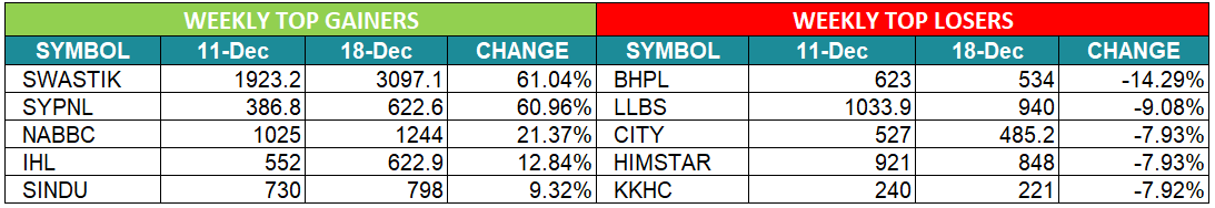 यस साता स्वस्तिक लघुवित्त वित्तीय संस्थाको शेयरमूल्य सर्वाधिक ६१.०४ प्रतिशत बढेको छ। गत साता १ हजार ९२३ रुपैयाँ २० पैसामा अन्तिम कारोबार भएको सो लघुवित्तको शेयर यस साता ३ हजार ९७ रुपैयाँ १० पैसामा अन्तिम कारोबार भएको छ। त्यस्तै, यस साता एसवाई प्यानल नेपालको शेयरमूल्य करिब ६१ प्रतिशत बढेको छ भने नारायणी डेभलपमेन्ट बैंकको शेयरमूल्य करिब साढे २१ प्रतिशत बढेको छ। यस साता बाराही हाइड्रोपावर पब्लिकको शेयरमूल्य सर्वाधिक १४.२९ प्रतिशत घटेको छ।