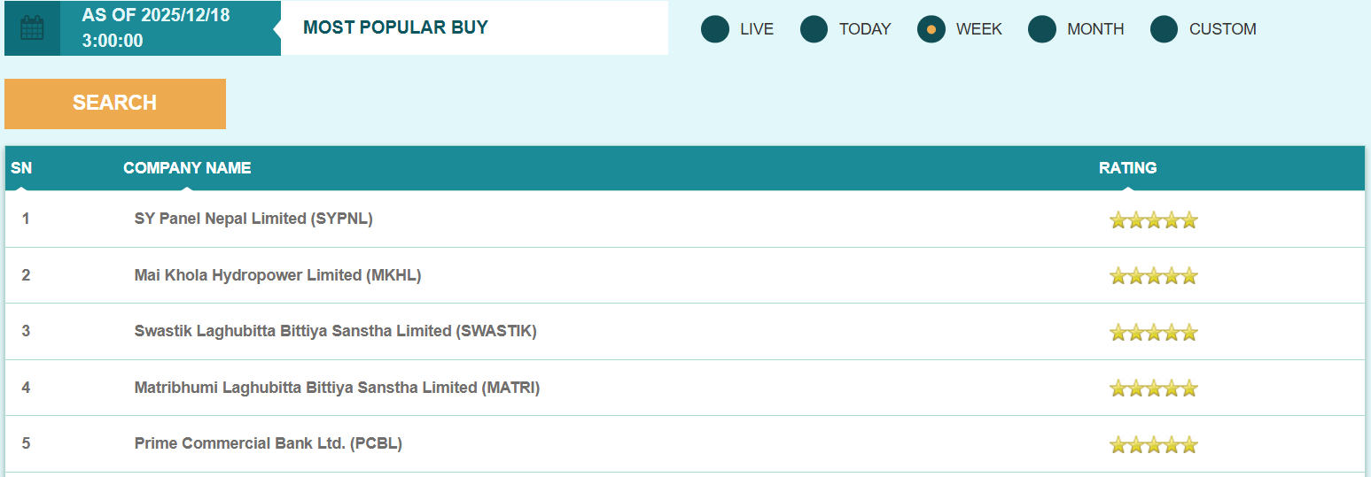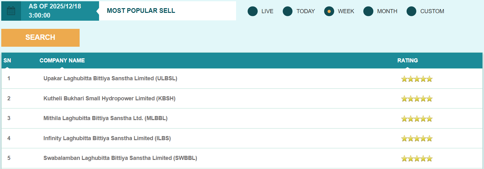 फ्लोरसिट विश्लेषण गर्दा यस साता एसवाई प्यानल नेपाल, माइ खोला हाइड्रोपावर, स्वस्तिक लघुवित्त वित्तीय संस्था लगायतका स्टकहरु मोस्ट पपुलर बाइ स्टक सूचीको शीर्ष स्थानमा रहेका छन् भने उपकार लघुवित्त वित्तीय संस्था, कुथेली बुखरी स्मल हाइड्रोपावर, मिथिला लघुवित्त वित्तीय संस्था लगायतका स्टकहरु मोस्ट पपुलर सेल स्टक सूचीको शीर्ष स्थानमा रहेका छन्।