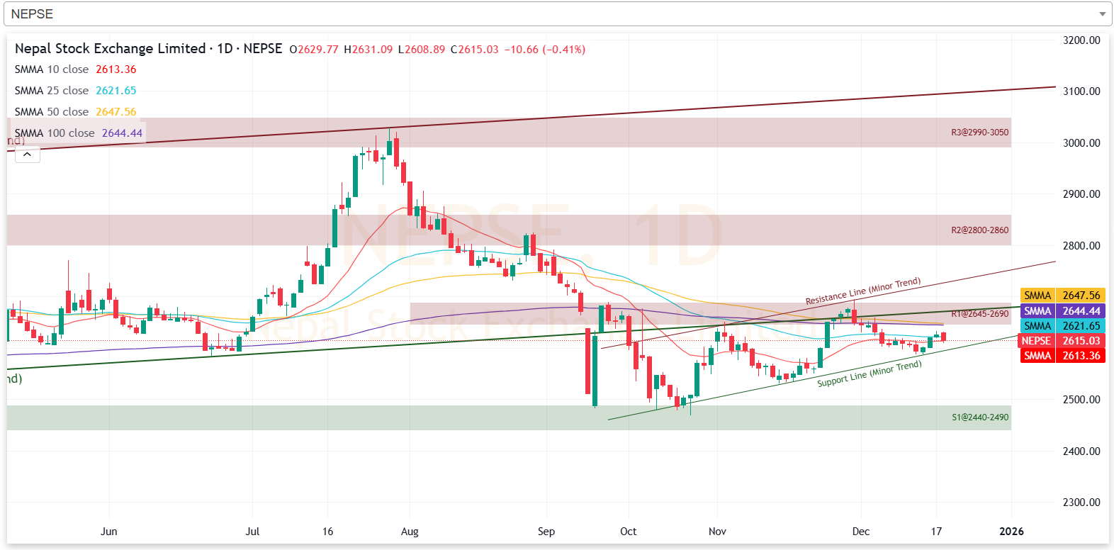 अघिल्लो साता प्रतिरोधको सामना गरी झरेको नेप्से, हाल पनि सोही अवस्थामा छ। हाल नेप्सेको प्रतिरोध क्षेत्र २६४५ देखि २६९० सम्म रहेको छ। आगामी दिनमा नेप्सेले ओरालो लागेमा २४४० देखि २४९० को क्षेत्रमा टेवा पाउने देखिन्छ।