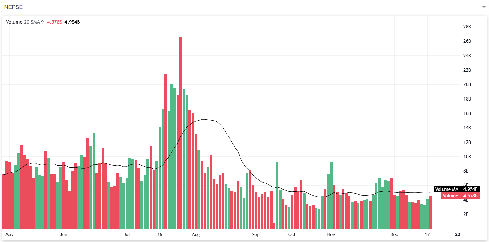 गत साता नेप्सेको भोल्यूम कमजोर रहेको छ। गत साता नेप्सेमा दैनिक औषतमा ३ अर्ब ८७ करोडको शेयर कारोबार भएको थियो। साताको अन्तिम कारोबार दिन नेप्सेको २० दिने औषत भोल्यूम ४ अर्ब ९५ करोड रहेको छ। २० दिने औषत भोल्यूमको तुलनामा गत साताको दैनिक औषत भोल्यूम २१.८१ प्रतिशत कम हो।