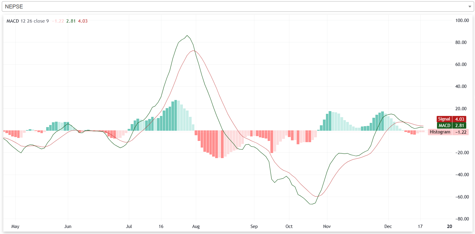 गत साता नेप्सेको एमएसिडी रेखा, सिग्नल रेखाभन्दा तल रहेको छ। त्यस्तै, नेप्सेको हिस्टोग्राम पनि नकारात्मक क्षेत्रमा रहेको छ। यसले गत साता नेप्से बियरिश प्रवृत्तिमा रहेको संकेत गर्दछ।