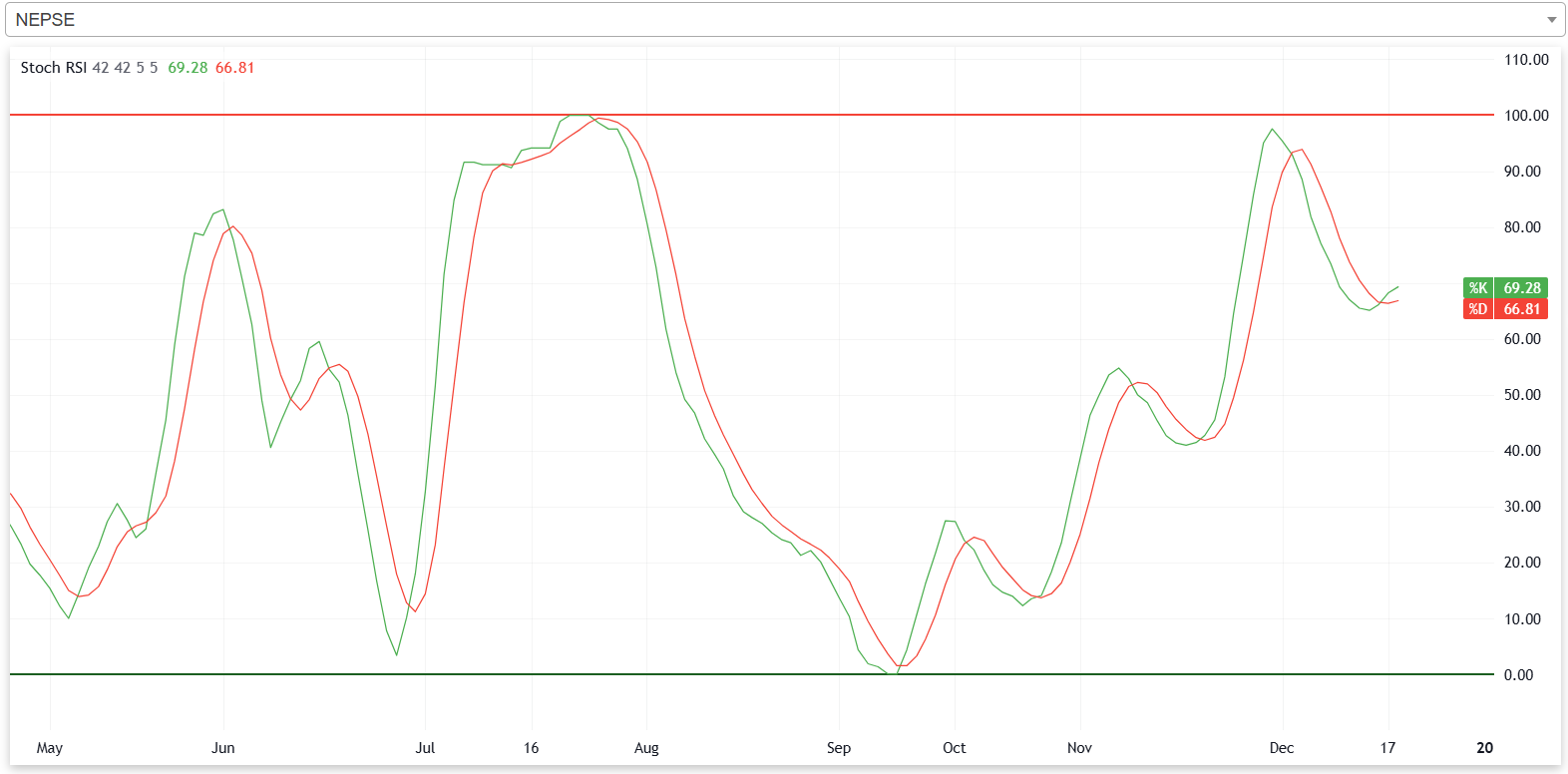 गत साता नेप्सेको स्टकास्टिक आरएसआई न्यूट्रल जोनमा रहेको छ। यसले गत साता बजारमा खरिदबिक्री चाप सन्तुलनमा रहेको संकेत गर्दछ।