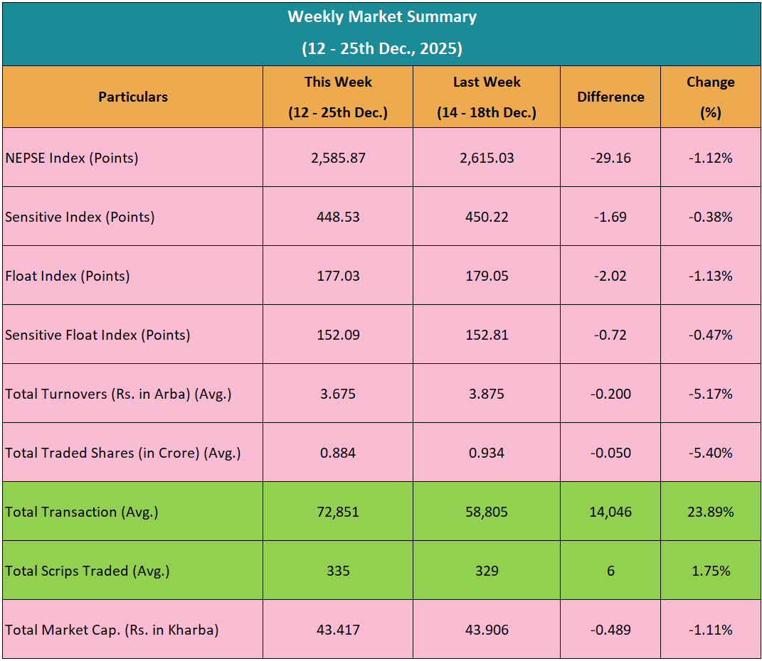 यस साता ४ कारोबार दिनका लागि बजार खुलेको थियो। जसमध्ये २ कारोबार दिन नेप्से सामान्य बढेको थियो भने २ कारोबार दिन घटेको थियो।