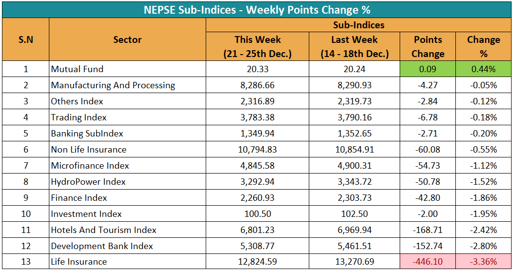 १३ उपसमूहमध्ये यस साता १ उपसमूहको परिसूचक बढेको छ भने १२ उपसमूहको परिसूचक घटेको छ। यस साता म्युचुअल फण्ड उपसमूहको परिसूचक ०.४४ प्रतिशत बढेको छ। गत साता २०.२४ विन्दुमा बन्द भएको यस उपसमूहको परिसूचक, यस साता ०.०९ अंक बढेर २०.३३ विन्दुमा पुगेको छ।